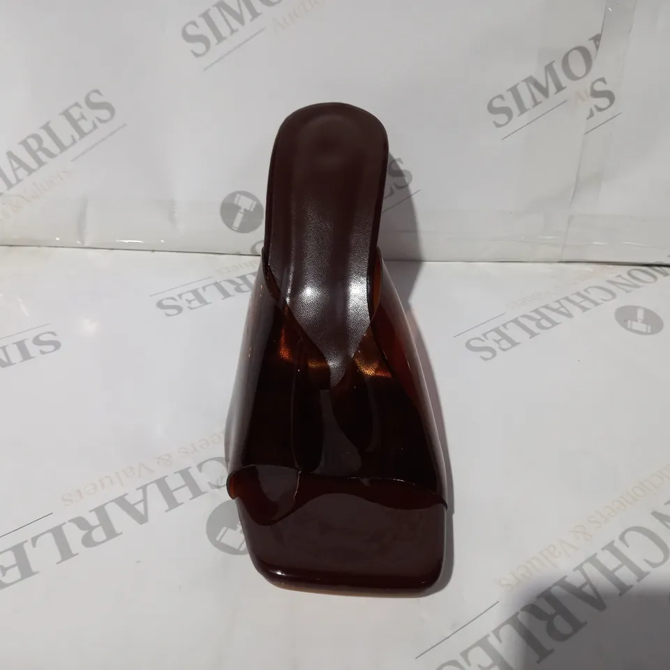 BOXED PAIR OF DESIGNER OPEN TOE HEELED SHOES IN TRANSPARENT BROWN EU SIZE 39