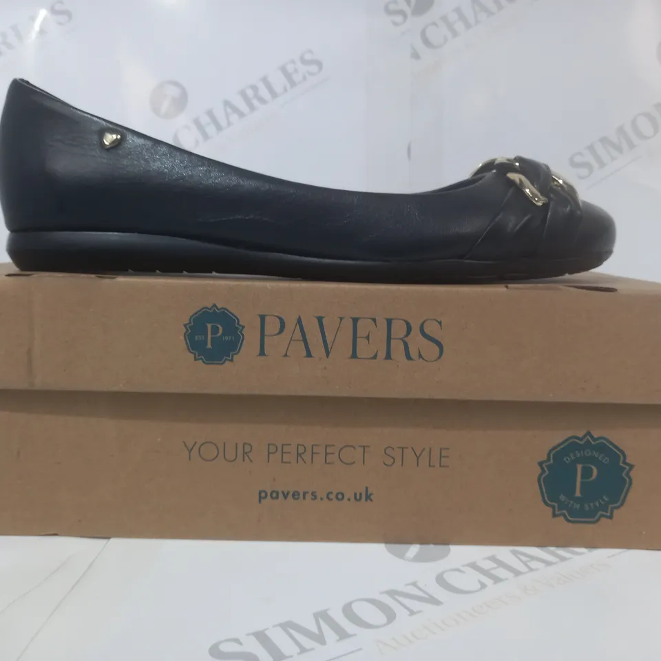 BOXED PAIR OF PAVERS SLIP-ON SHOES IN BLACK W. GOLD EFFECT CHAIN DETAIL SIZE 6