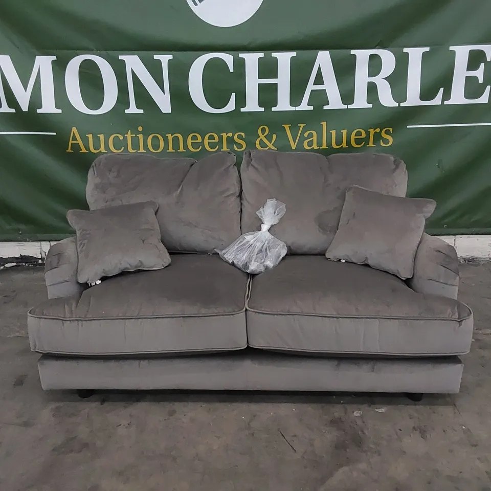 DESIGNER 2 SEATER GREY VELVET SOFA WITH CUSHIONS