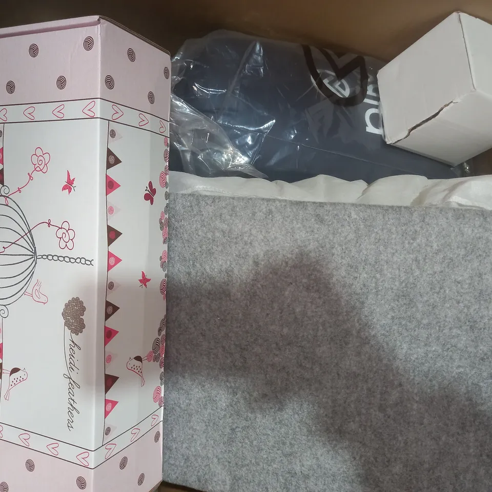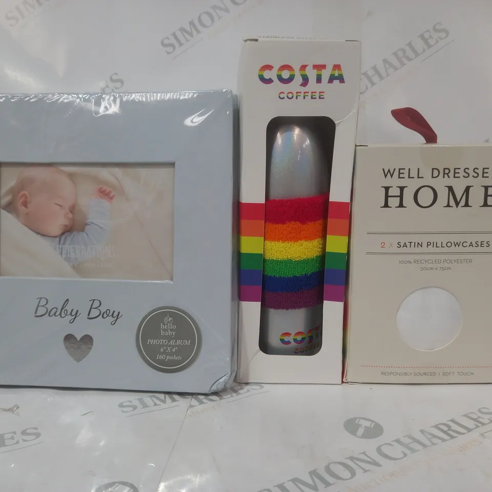BOX OF APPROXIMATELY 15 ASSORTED HOUSEHOLD ITEMS TO INCLUDE SATIN PILLOWCASES, COSTA COFFEE STAINLESS STEEL BOTTLE, BABY BOY PHOTO ALBUM, ETC