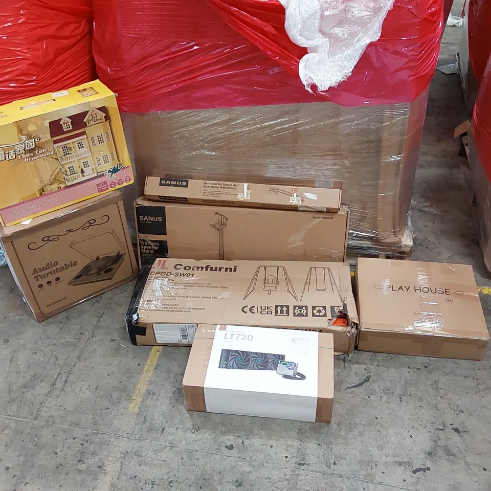 PALLET OF ASSORTED ITEMS INCLUDING: 360MM LIQUID CPU COOLER, AUDIO TURNTABLE, CHILDREN'S SWING, WIRELESS SPEAKER STAND, PLAYHOUSES