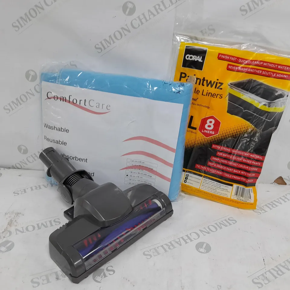 APPROXIMATELY 15 ASSORTED HOUSEHOLD ITEMS TO INCLUDE VACUUM CLEANER HEAD, PAINTWIZ SCUTTLE LINERS, WATERPROOF BED PAD, ETC