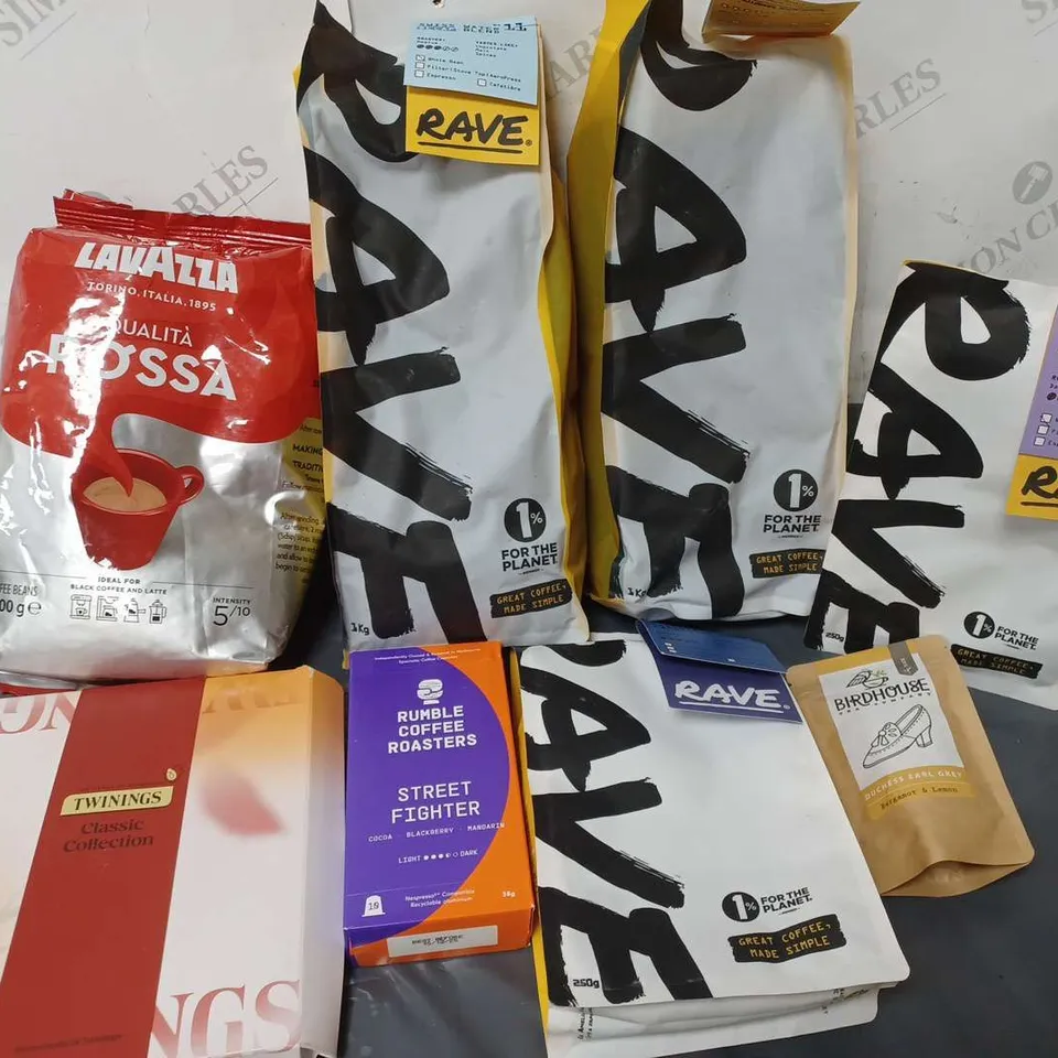 APPROXIMATELY 8 ASSORTES COFFEE & TEA ITEMS TO INCLUDE RAVE N011 SWISS DECAF WATER BLEND WHOLEBEAN COFFEE (1kg), TWININS BLACK TEA CLASSIC COLLECTION, LAVAZZA QUALITA ROSSA COFFEE BEANS (1kg), ETC