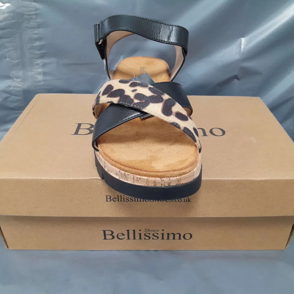BOXED PAIR OF BELLISSIMO OPEN TOE LOW WEDGE SANDALS IN BLACK/ANIMAL PRINT SIZE 6