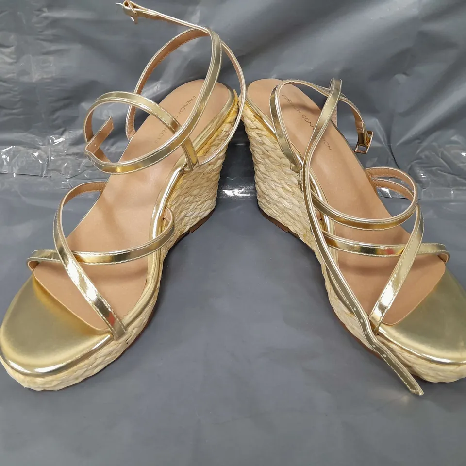 BOXED PAIR OF FRENCH CONNECTION WEDGE STRAPPY SANDALS IN METALLIC GOLD UK SIZE 5