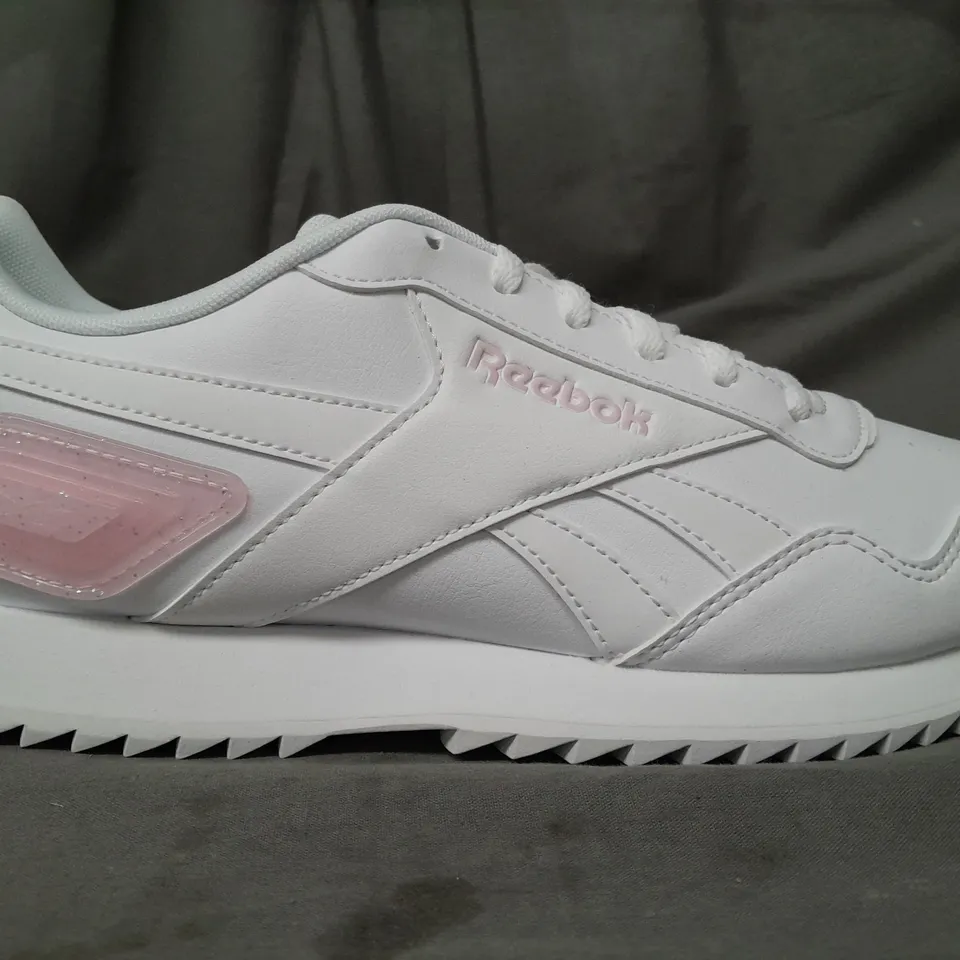 BOXED PAIR OF REEBOK ROYAL GLIDE SHOES IN WHITE/PINK SIZE UK 8