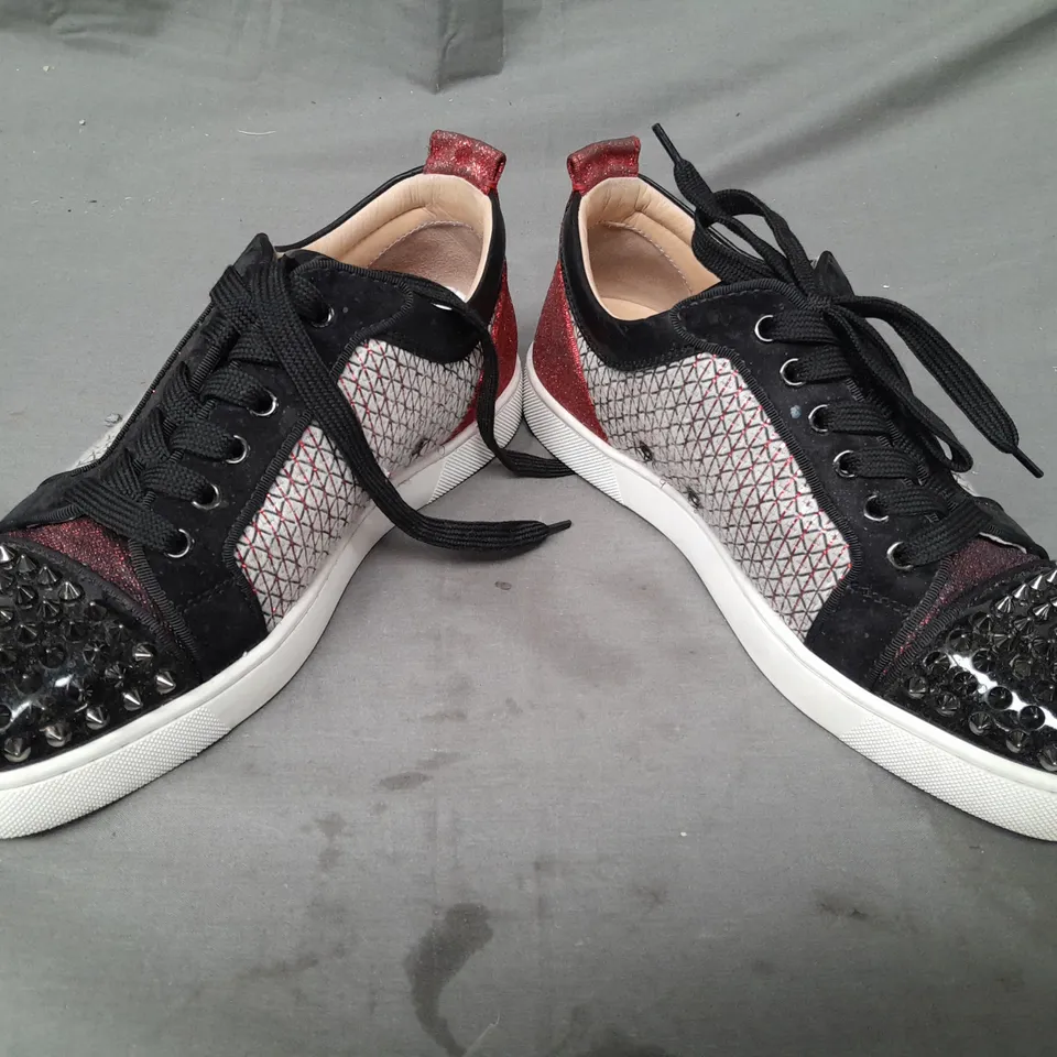 BOXED PAIR OF CHRISTIAN LOUBOUTIN LOUIS JUNIOR SPIKES FLAT SHOES IN BLACK/RED EU SIZE 40