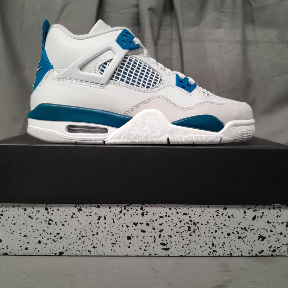 BOXED PAIR OF NIKE AIR JORDAN 4 RETRO SHOES IN OFF WHITE/BLUE UK SIZE 5