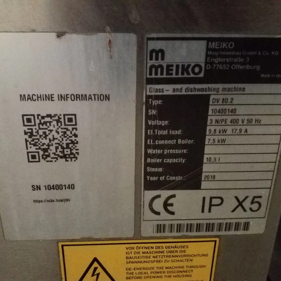 MEIKO DV80.2 HOOD DISHWASHER WITH VENTILATION ABOVE. (SEPARATE WATER SOFTNENING BOX)