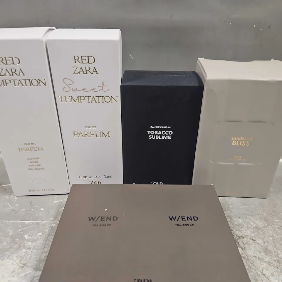 5 ASSORTED ZARA PRODUCTS TO INCLUDE TOBACCO SUBLIME, W/END SET, SWEET TEMPTATION, ETC