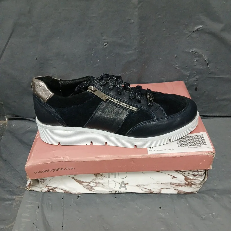PAIR OF MODA IN PELLE AMBIENE LEATHER WEDGE TRAINER IN NAVY SIZE 7