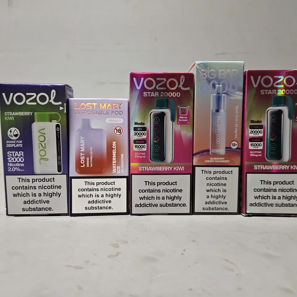 APPROXIMATELY 15 ASSORTED E-CIGARETTE PRODUCTS TO INCLUDE -VOZOL , LOST MARY , BIG BAR ETC