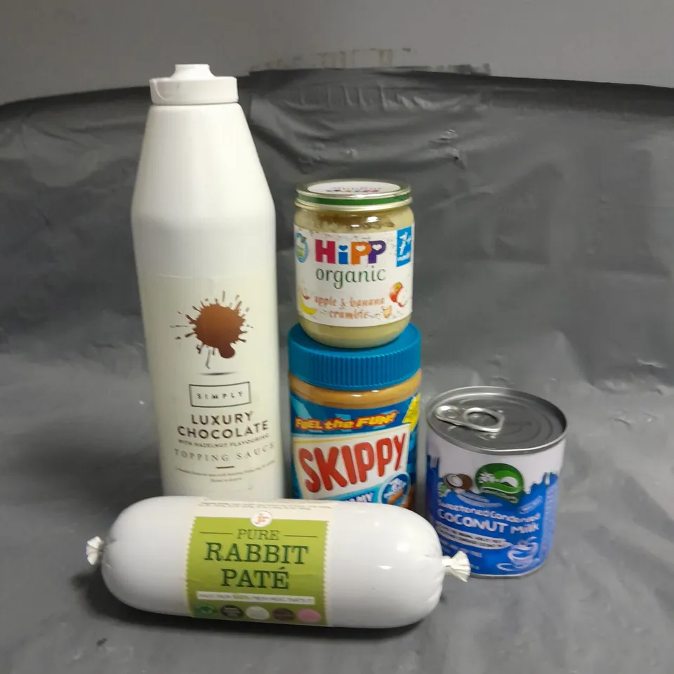 APPROXIMATELY 15 FOOD AND DRINK ITEMS TO INCLUDE PURE RABBIT PATE, HIPP ORGANIC BABY FOOD AND SKIPPY PEANUT BUTTER