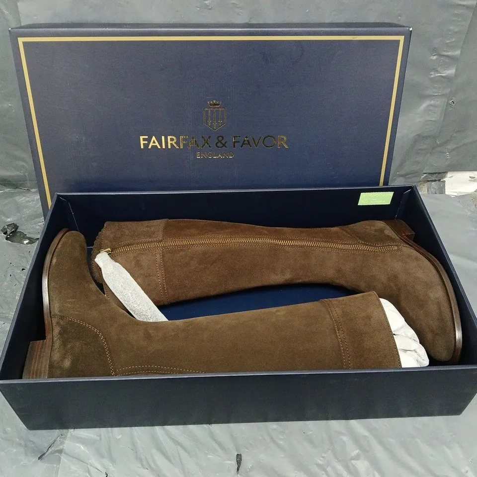 BOXED PAIR OF FAIRFAX & FAVOR WOMENS REGINA CHOCOLATE SUEDE BOOTS - UK 6