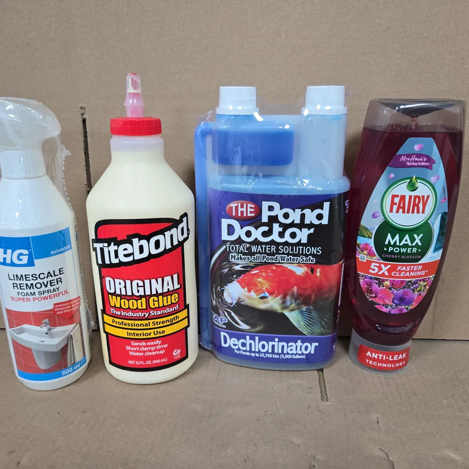 TOTE OF APPROXIMATELY 6 ASSORTED ITEMS TO INCLUDE - WOOD GLUE , FAIRY MAX ,THE POND DOCTOR ETC