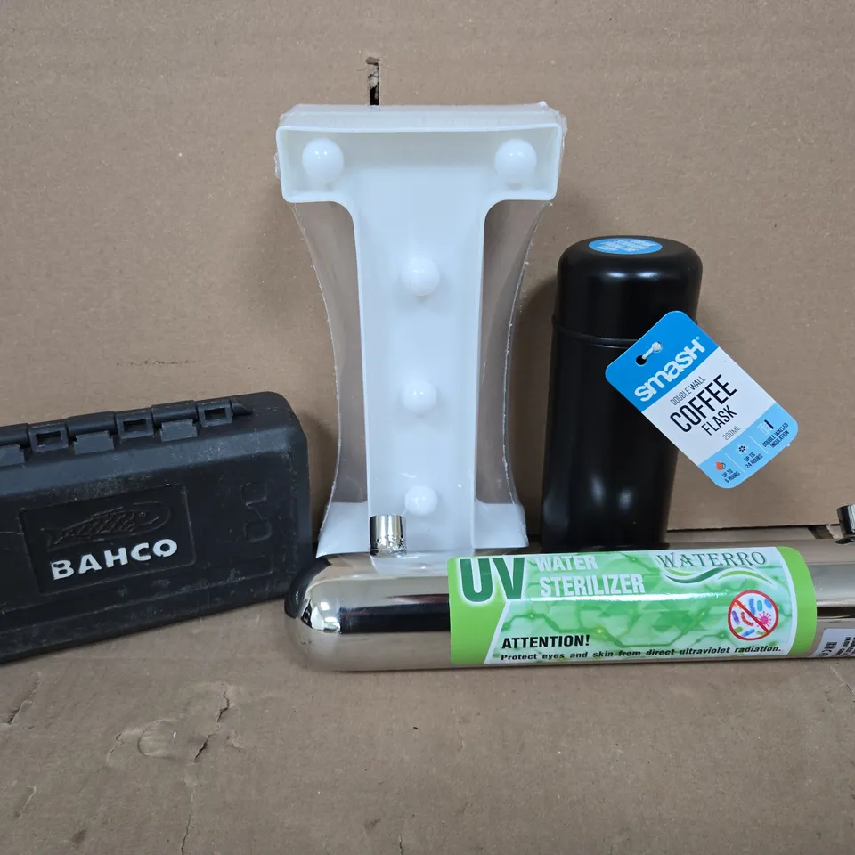 TOTE OF APPROXIMATELY 6 ASSORTED ITEMS TO INCLUDE - COFFEE FLASK , WATER STERILIZER ETC