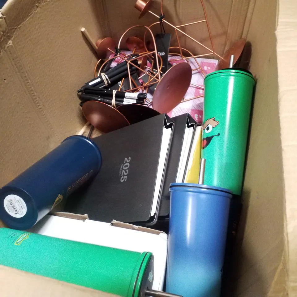 BOX CONTAINING ASSORTED PRODUCTS INCLUDING SIMPSONS BOWL, TOTE BAGS, METAL SMOOTHIE CUPS, 2025 WEEKLY PLANNERS & CANDLE HOLDERS