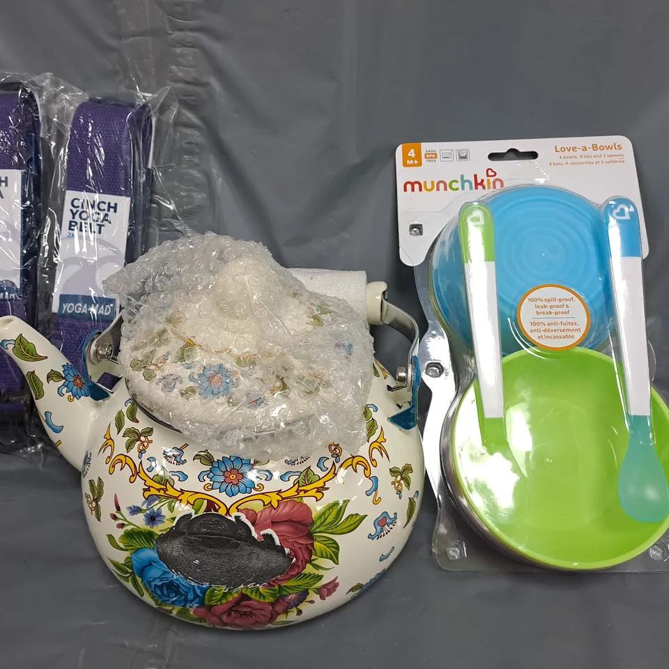 APPROXIMATELY 10 ASSORTED HOUSEHOLD ITEMS TO INCLUDE MUNCHKIN LOVE-A-BOWLS, TEAPOT, CINCH YOGA BELT, ETC
