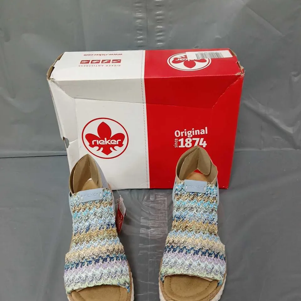 BOXED PAIR OF RIEKER WEDGE SANDAL AQUA SIZE 3.5