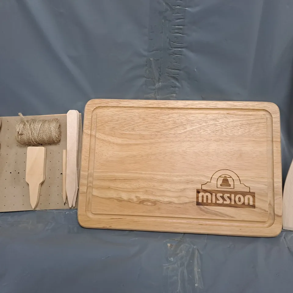 APPROXIMATELY 8 ASSORTED HOUSEHOLD ITEMS TO INCLUDE MISSION CUTTING BOARD, FLOW HEADSET PADS, ETC