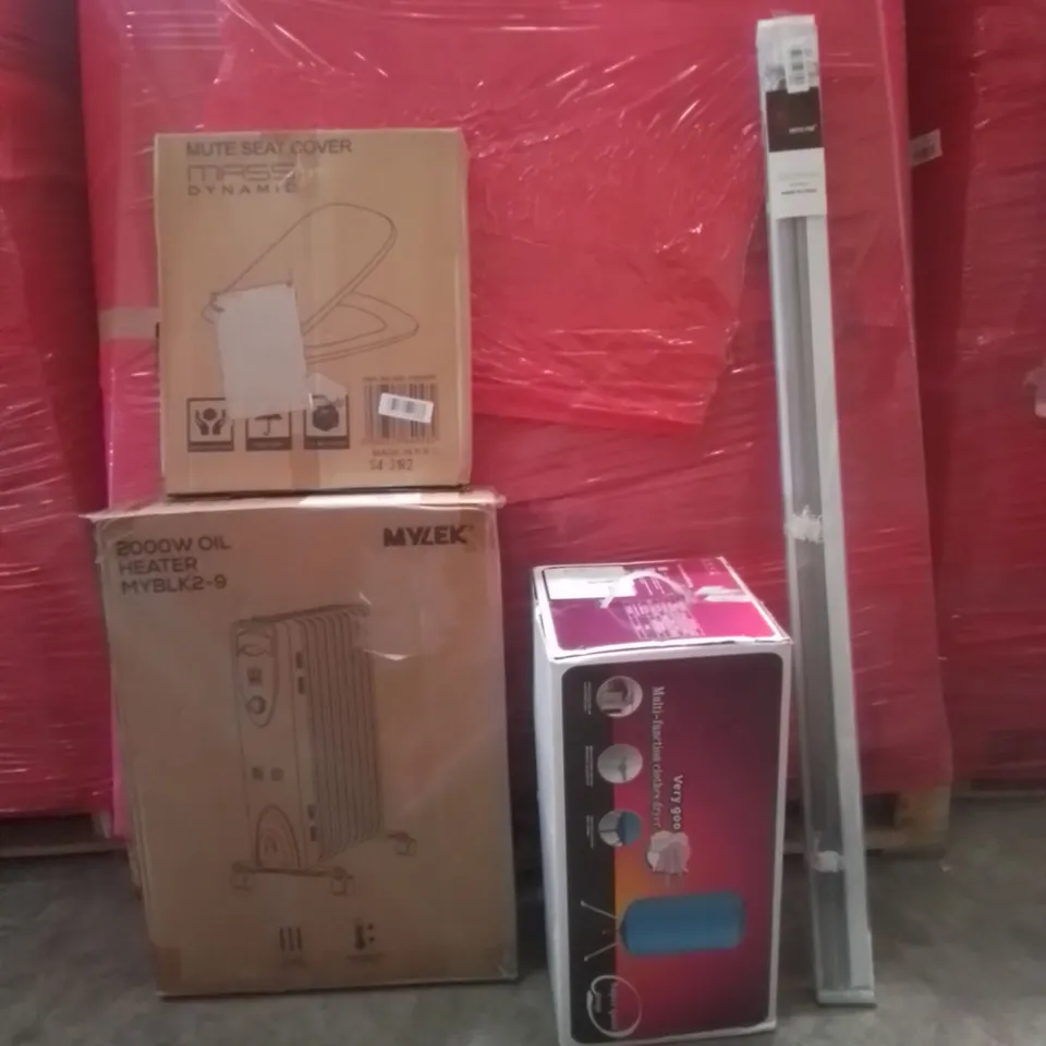 PALLET OF ASSORTED HOUSEHOLD GOODS AND FURNITURE TO INCLUDE;MASS DYNAMIC SEAT COVER, MYLEK 2000W OIL HEATER MYBLK2-9, VENETIAN BLINDS ETC