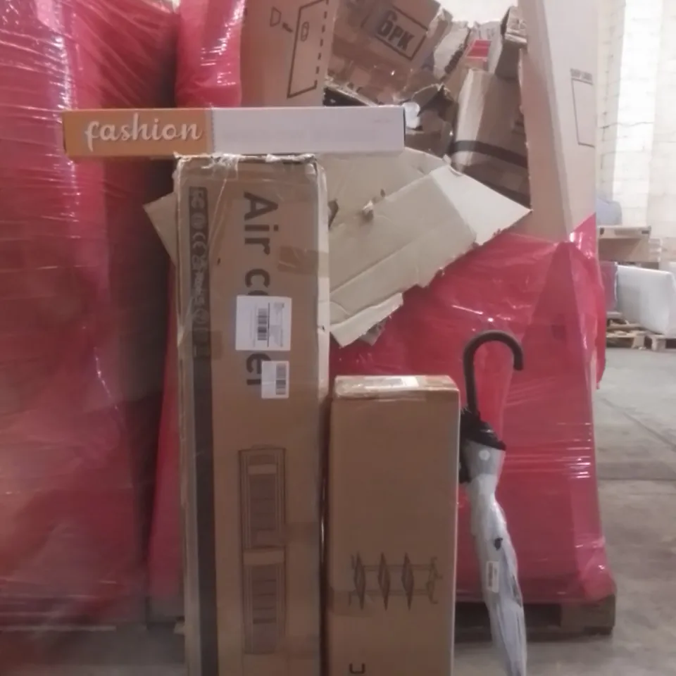 PALLET OF ASSORTED HOUSEHOLD GOODS AND FURNITURE TO INCLUDE; AIR COOLER, HOMIDEC RACK, WINDOW BLINDS ETC