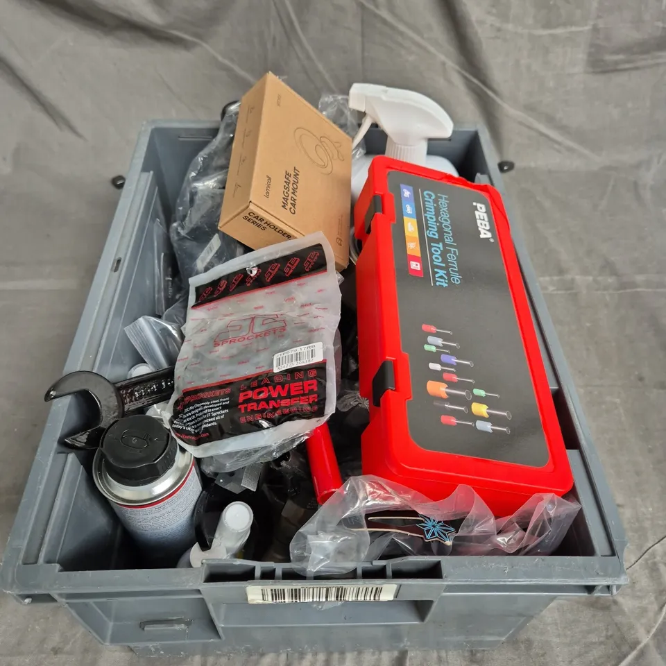 TOTE OF APPROXIMATELY. 20 ASSORTED CAR ITEMS TO INCLUDE CRIMPING TOOL KIT , CARAVAN CLEANER AND ENGINE FLUSH