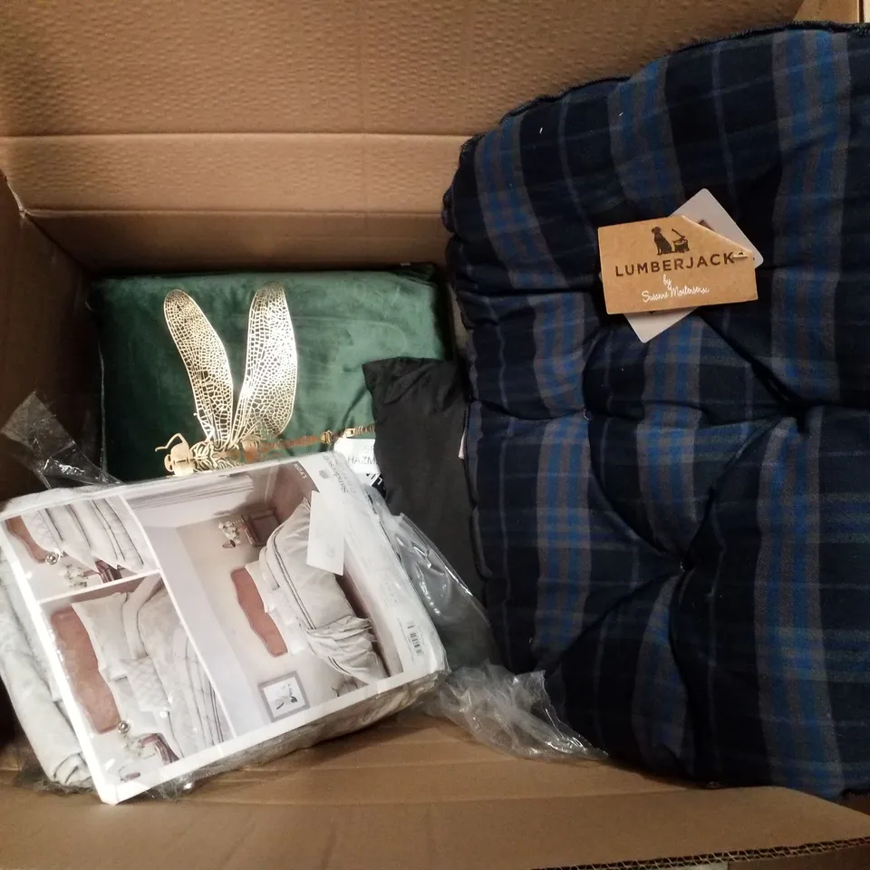 BOX CONTAINING ASSORTED FABRICS INCLUDING PET BED, CUSHIONS & CURTAINS