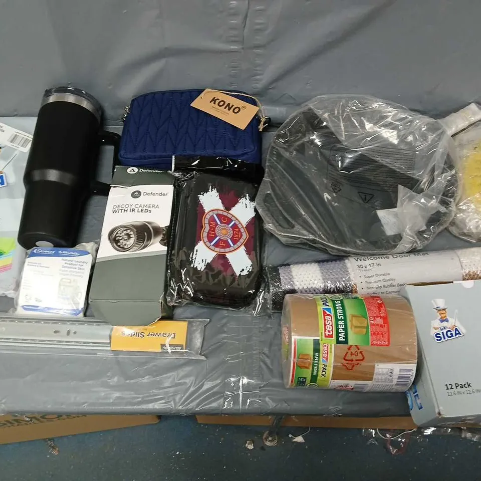 BOX OF APPROXIMATELY 15 ASSORTED ITEMS TO INCLUDE - CLEANING CLOTHS, DECOY CAMERAS, AND KONO BAG IN NAVY ETC.