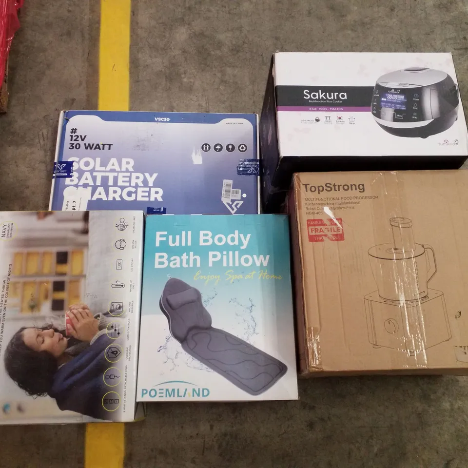 PALLET CONTAINING ASSORTED PRODUCTS INCLUDING MULTIFUNCTION RICE COOKER, MULTIFUNCTIONAL FOOD PROCESSOR, FULL BODY BATH PILLOW, HEATED THROW & SOLAR BATTERY CHARGER