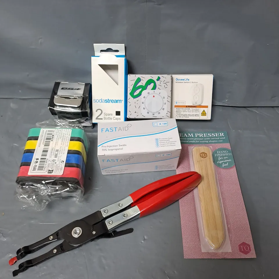 APPROXIMATELY 15 ASSORTED HOUSEHOLD ITEMS TO INCLUDE SEAM PRESSER, KITCHEN TIMER, PRE INJECTION SWABS ETC