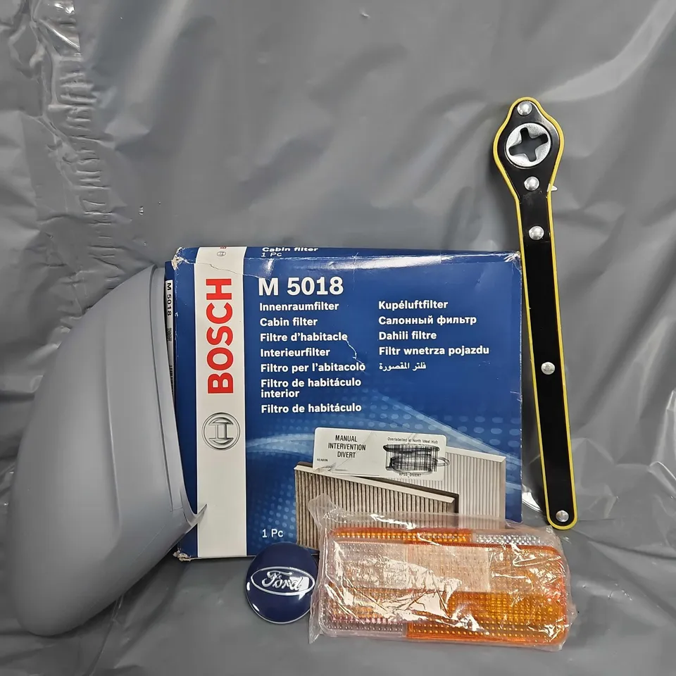 BOX OF APPROXIMATELY 20 ASSORTED ITEMS TO INCLUDE - CABIN FILTER , FORD WHEEL HUB CAPS , GREY WINGMIRROR COVER ETC