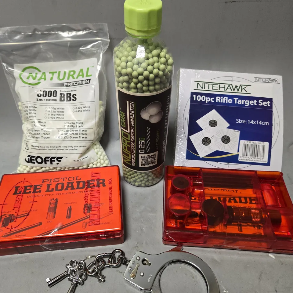 APPROX 8 ASSORTED ITEMS TO INCLUDE RIFLE TARGET SET, BB AMMUNITION, HANDCUFF, ETC