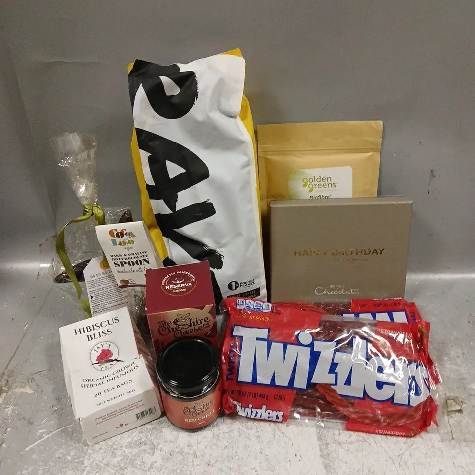 APPROXIMATELY 12 ASSORTED FOOD & DRINK ITEMS TO INCLUDE - HOTEL CHOCOLAT HAPPY BIRTHDAY BOX - TWIZZLERS STRAWBERRY - THE CHESHIRE CHEESE RED CHILLI JAM - ETC