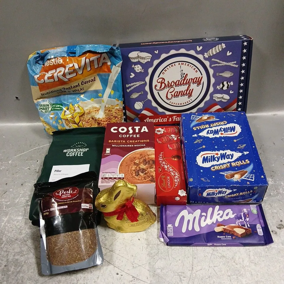 APPROXIMATELY 12 ASSORTED FOOD & DRINK ITEMS TO INCLUDE - MILKY WAY CRISPY ROLLS - BROADWAY CANDY BLISSFUL KISSES - LINDT LINDOR EGGS - ETC