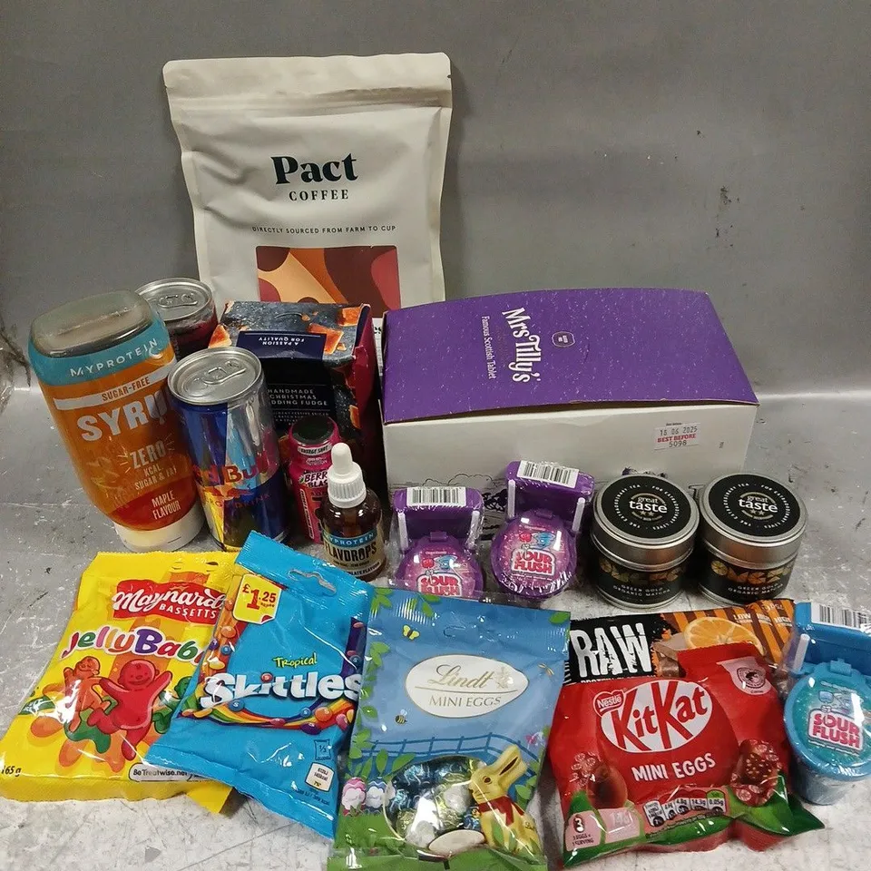 APPROXIMATELY 15 ASSORTED FOOD & DRINK ITEMS TO INCLUDE - MR TILLYS SCOTTISH TABLET - LINDT MINI EGGS - MYPROTEIN SUGAR FREE MAPLE SYRUP - ETC