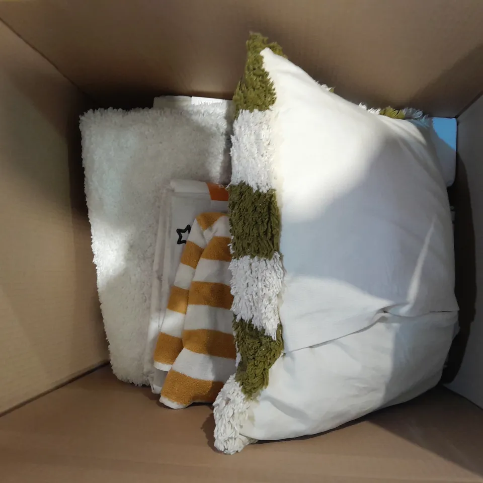 BOX OF APPROXIMATELY 10 ASSORTED BEDDING AND SOFT FURNISHING ITEMS TO INCLUDE - THROW PILLOWS - DUVET SETS - THROW BLANET ETC.
