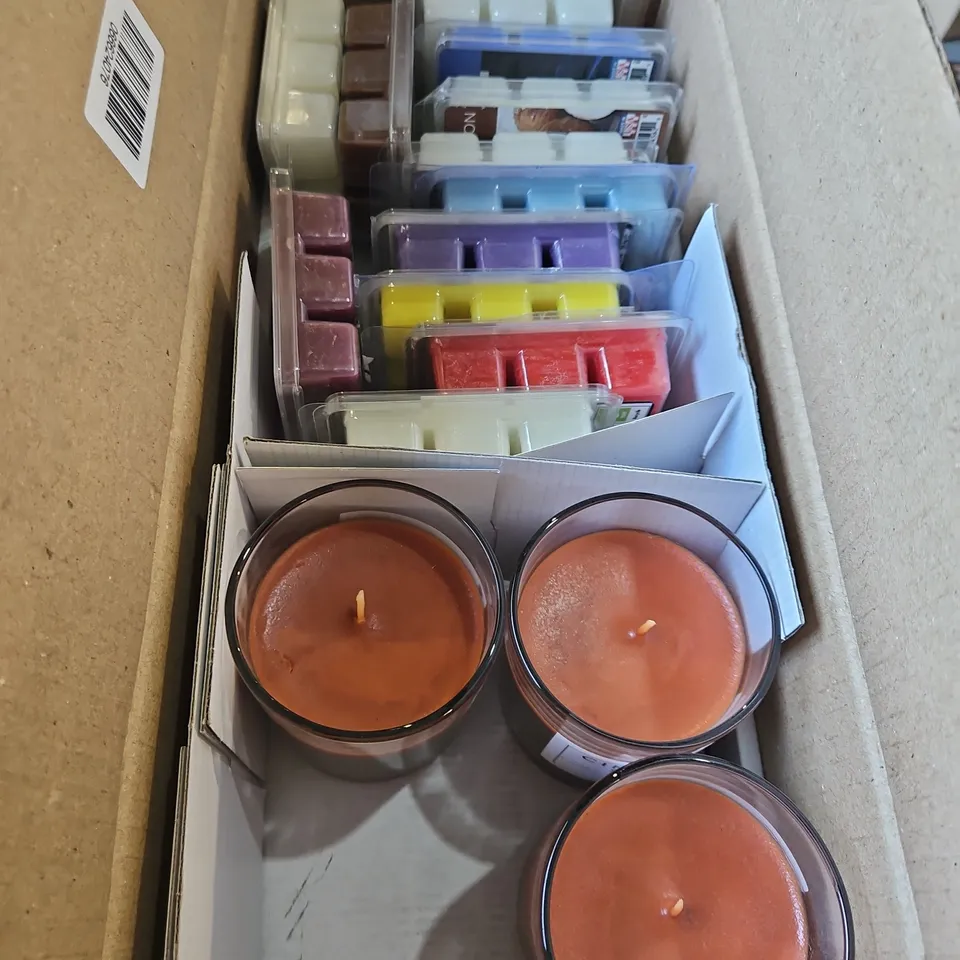 BOX OF ASSORTED CANDLES AND WAX MELTS