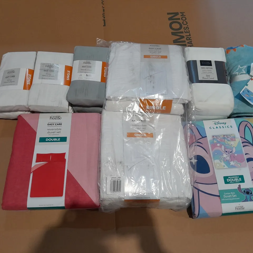 BOX OF APPROXIMATELY 10 ASSORTED BEDDING AND SOFT FURNISHING ITEMS TO INCLUDE - FITTED SHEET - DUVET SETS - TOWELS ETC.