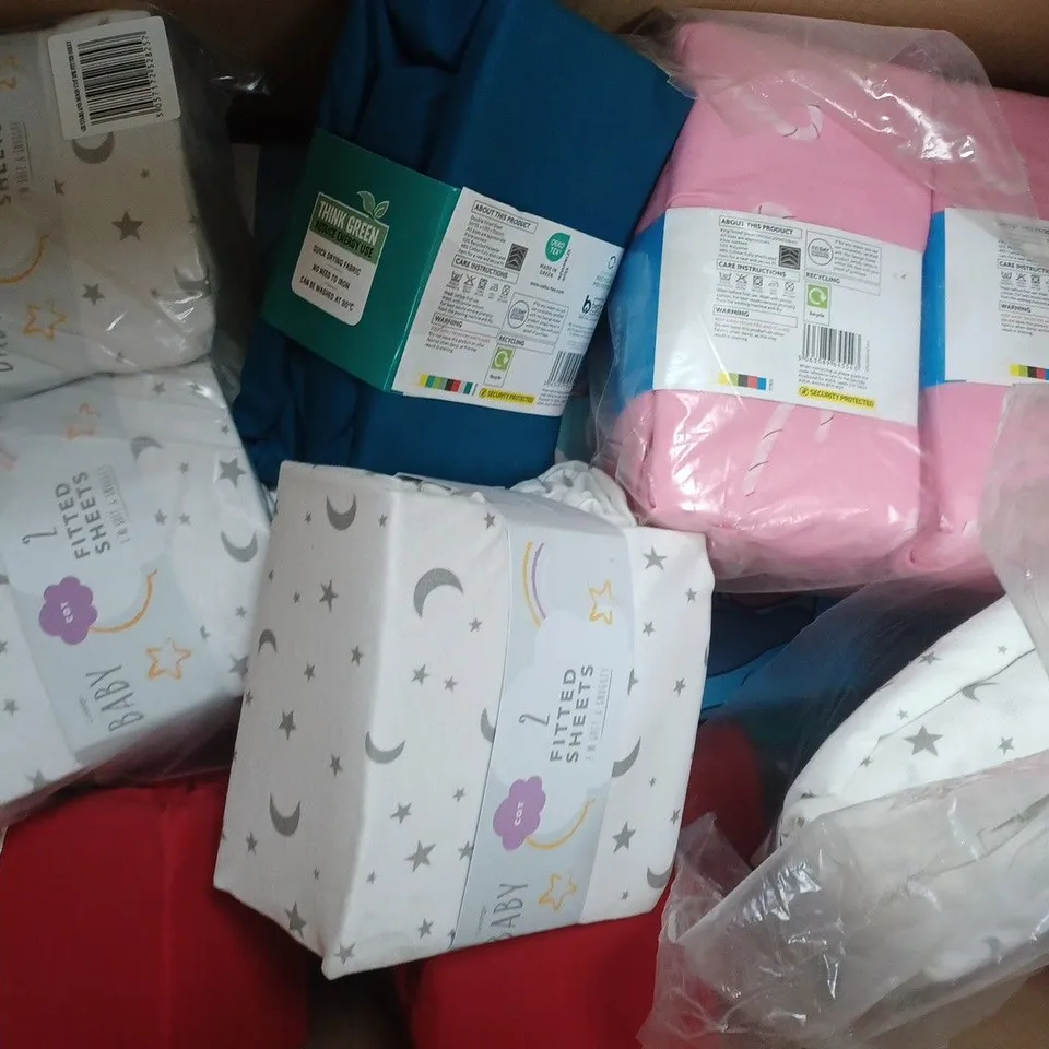 BOX OF APPROXIMATELY 15 ASSORTED BEDDING ITEMS TO INCLUDE DISNEY STITCH DUVET SET, FITTED SHEETS, ETC - COLOURS AND SIZES MAY VARY - COLLECTION ONLY
