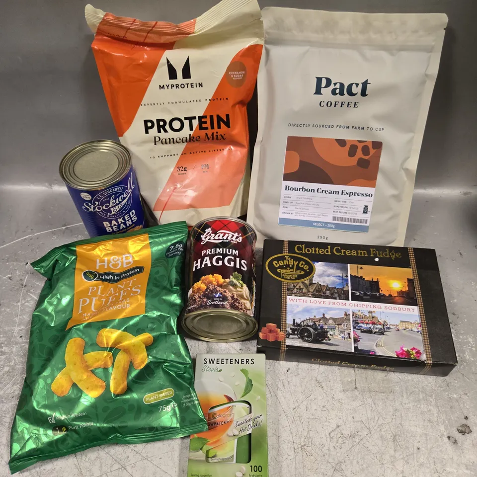 APPROXIMATELY 10 ASSORTED FOOD/DRINK PRODUCTS TO INCLUDE PACT COFFEE, CLOTTED CREAM FUDGE, PROTEIN PANCAKE MIX ETC