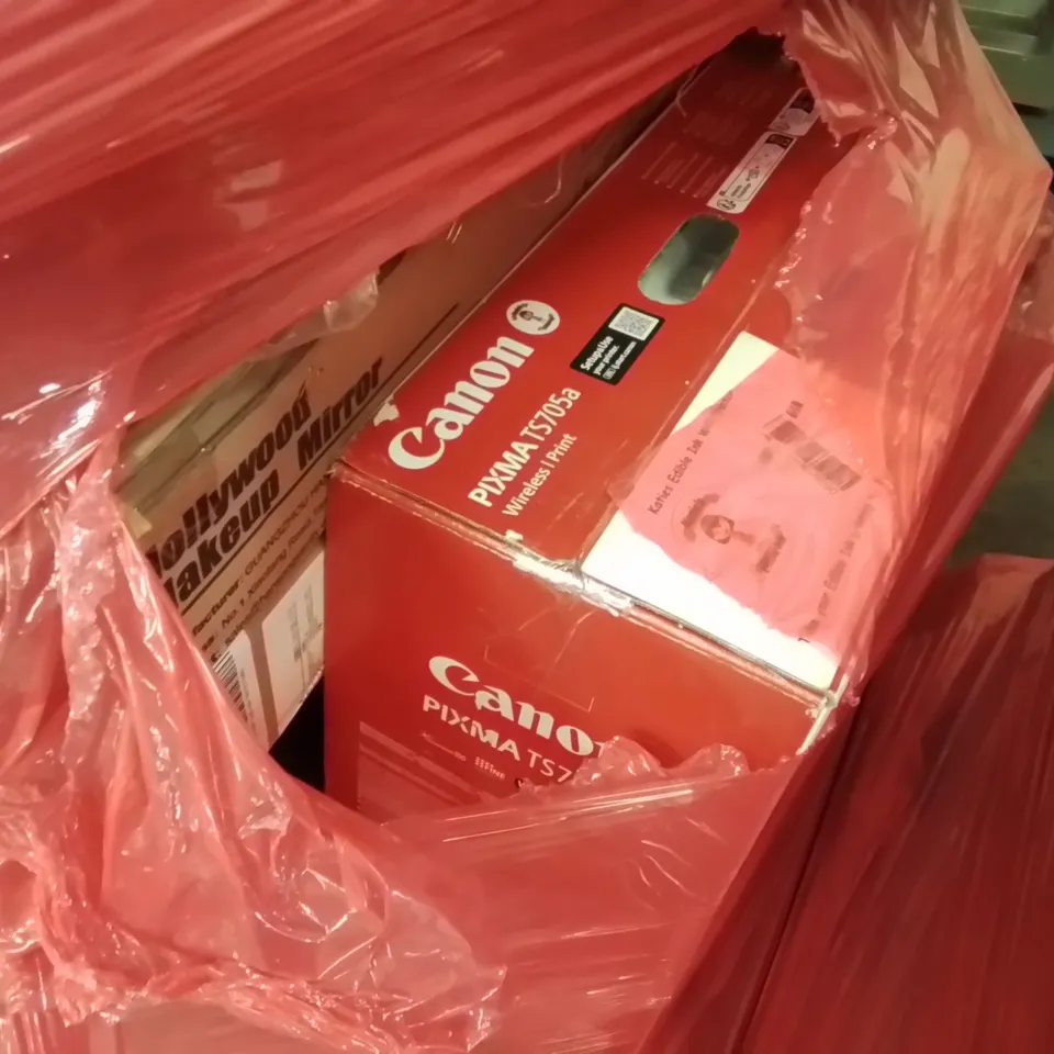 PALLET OF ASSORTED ITEMS TO INCLUDE: CANON WIRELESS PRINTER, HOLLYWOOD MAKEUP MIRROR, GAMING CHAIR, STORAGE DRAWERS, PAPER SHREDDER ECT