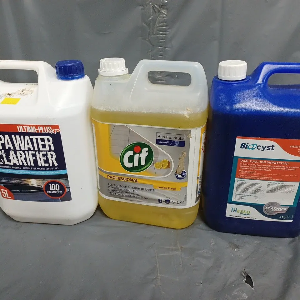 3 ASSORTED LIQUIDS TO INCLUDE BIOCYST DISINFECTANT, CIF FLOOR CLEANER, SPA WATER CLARIFIER - COLLECTION ONLY