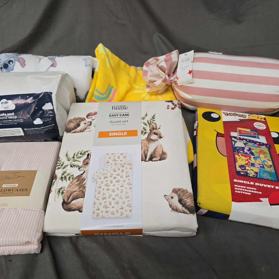 APPROXIMATELY 20 ASSORTED HOUSEHOLD PRODUCTS TO INCLUDE BED SHEETS, CUSHIONS, PILLOW CASES ETC