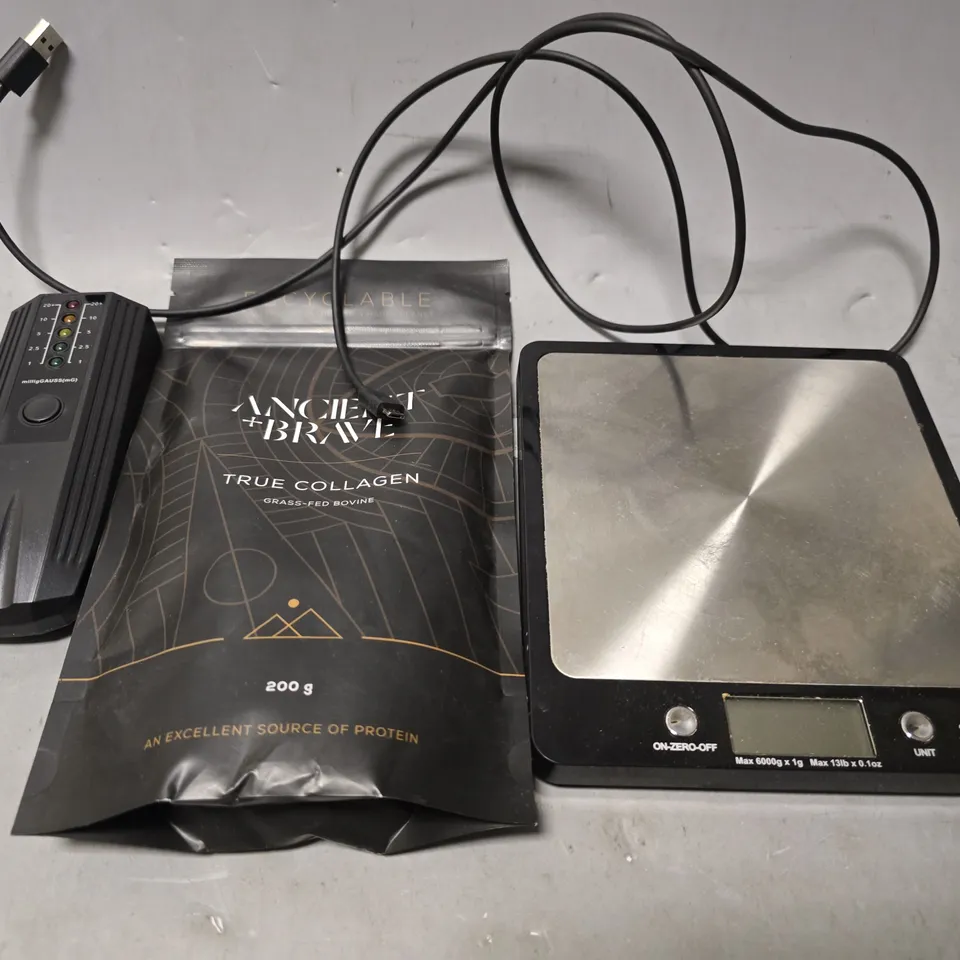 BOX OF APPROXIAMTELY 15 ASSORTED ITEMS TO INCLUDE - SALTER SCALE , RADIATION TESTER , MICRO USB CABLE ETC
