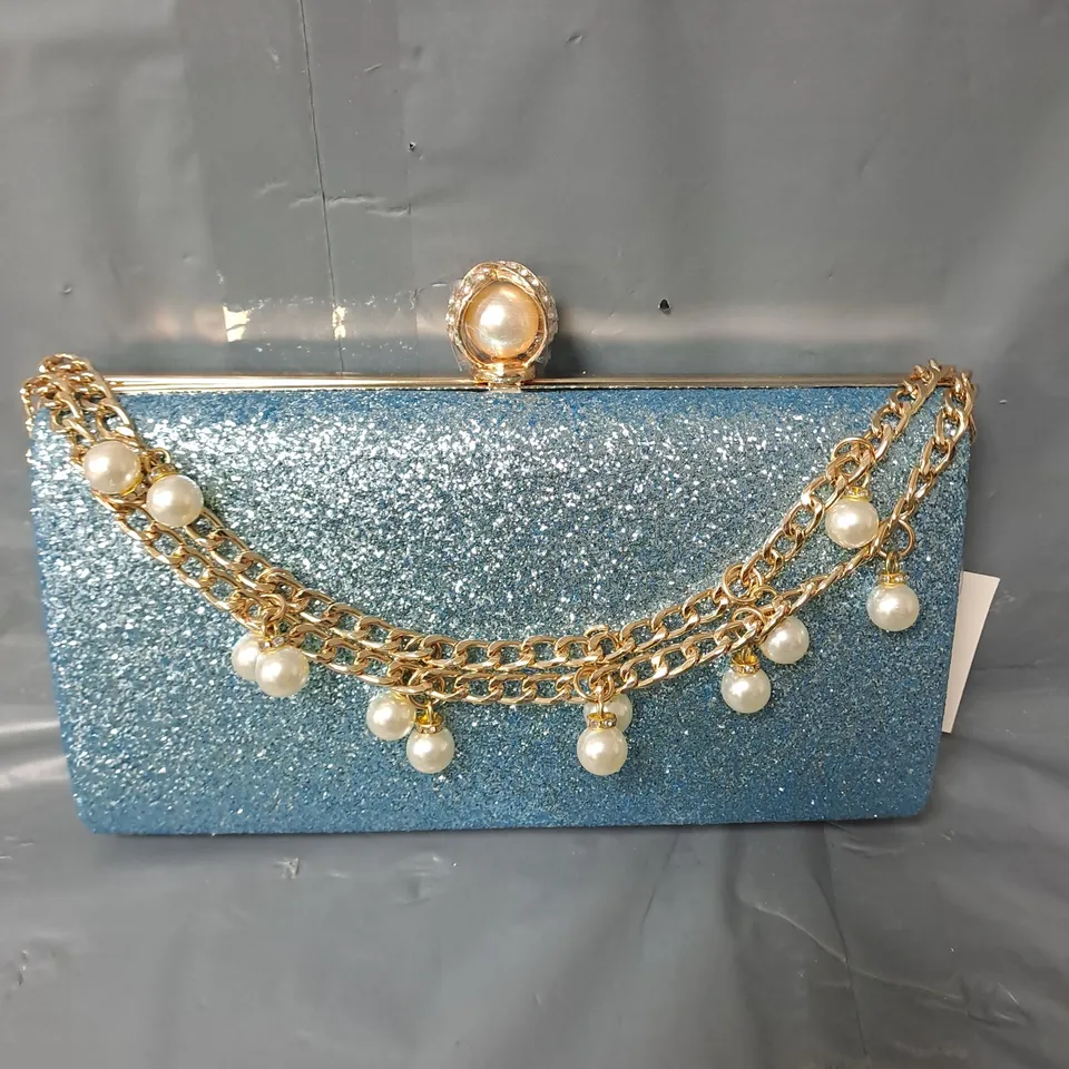 LADIES CLUTCH BAG - BLUE GLITTER EFFECT WITH GOLD COLOURED AND PEARL EFFECT CHAIN