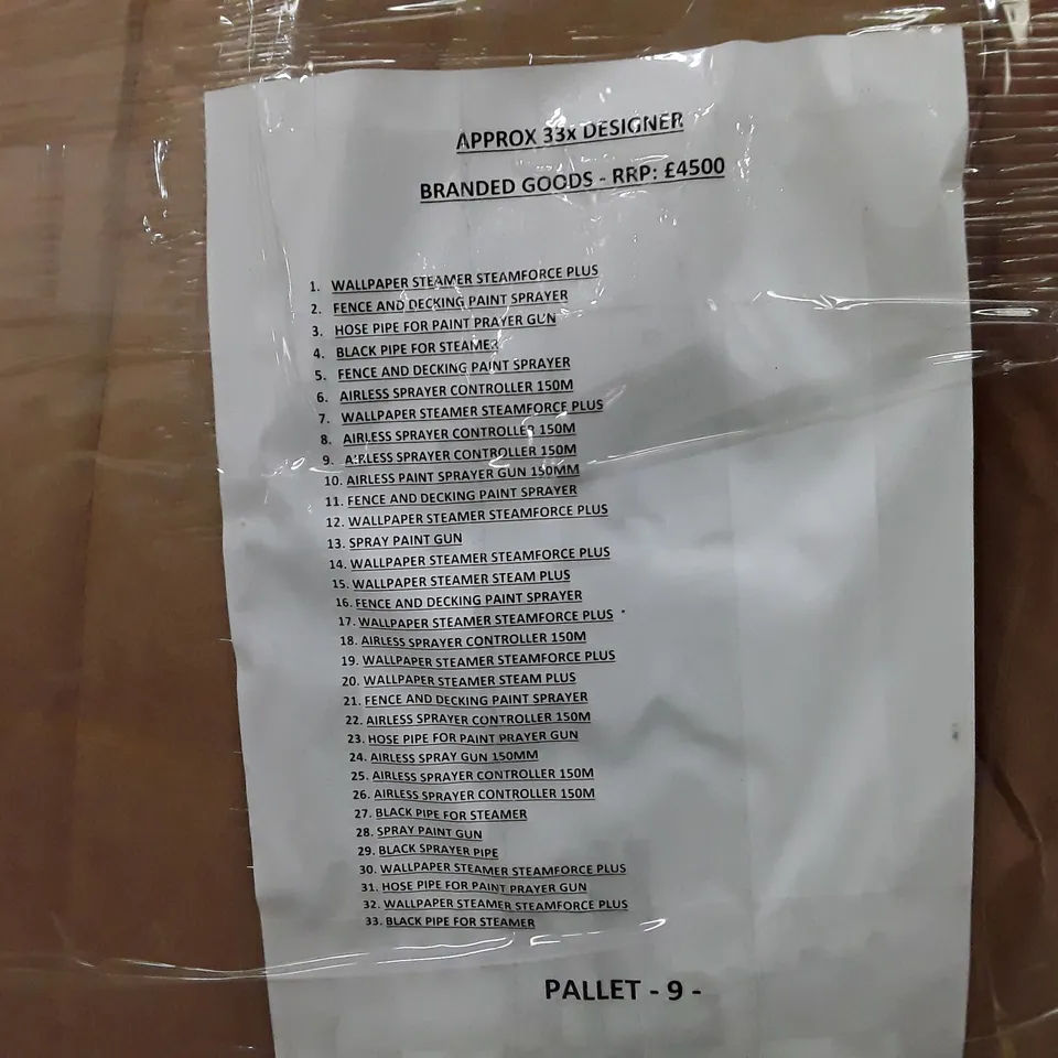 PALLET OF ASSORTED DESIGNER BRANDED GOODS INCLUDING: AIRLESS SPRAYERS, WALLPAPER STEAMERS, PAINT SPRAYERS ECT