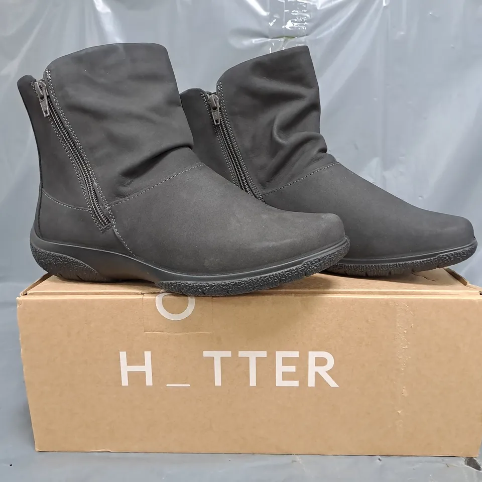 BOXED PAIR OF HOTTER WHISPER EXTRA WIDE BOOTS IN DARK GREY SIZE UK 6