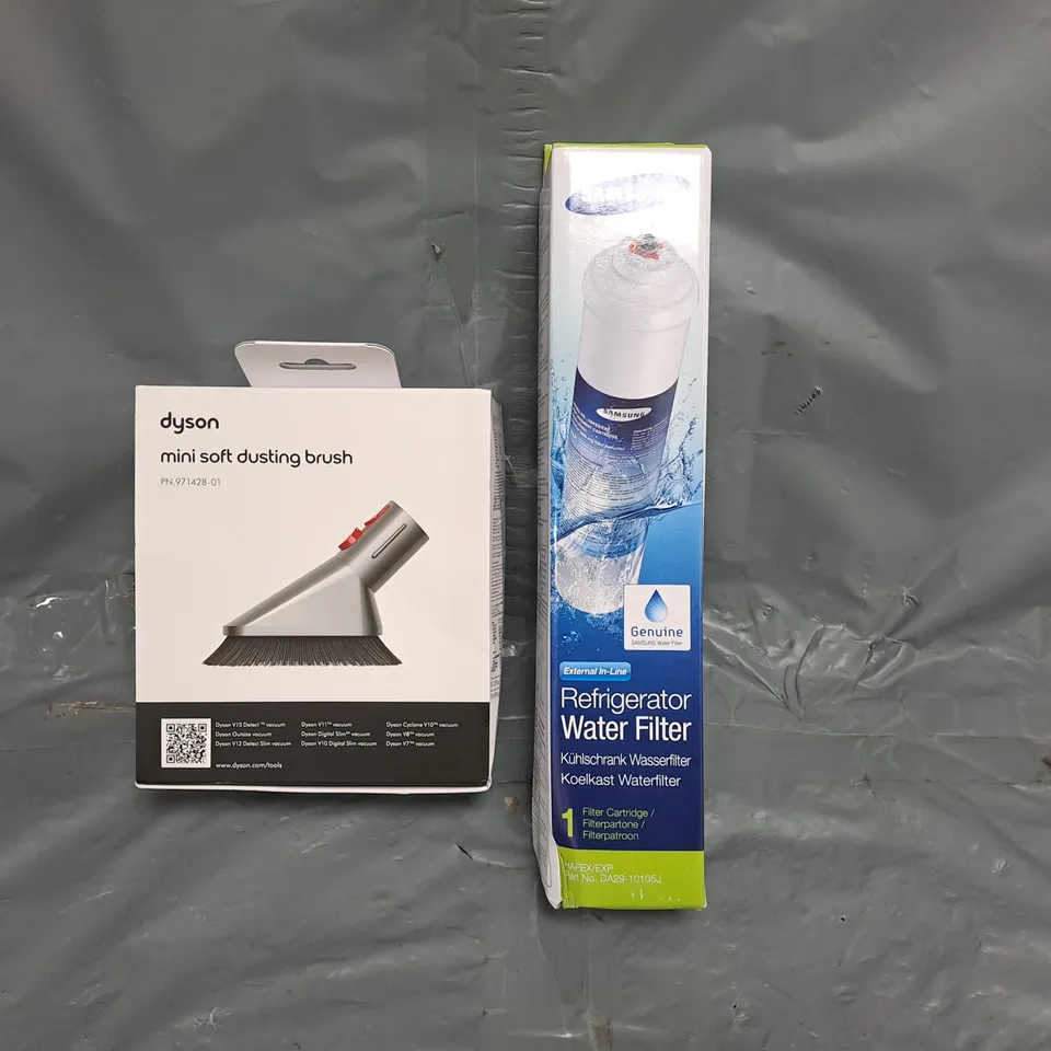 BOX OF APPROXIMATELY 15 ASSORTED HOUSEHOLD ITEMS TO INCLUDE DYSON MINI SOFT DUSTING BRUSH, SAMSUNG REFRIGERATOR WATER FILTER, ETC - COLLECTION ONLY