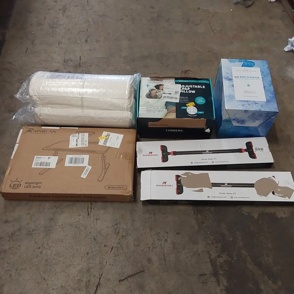 PALLET OF ASSORTED ITEMS INCLUDING: GLASS ALKALINE WATER COUNTERTOP UNIT, ADJUSTABLE CPAP PILLOW, CUSHION, FOLDABLE LAPTOP DESK, PULL-UP BARS ECT